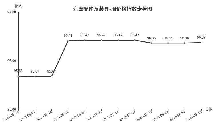 本周,汽摩配件及装具类价格指数收于96.37点,环比上涨0.01点。从二级分类看,汽车配件类、汽车装饰类价格指数均上涨0.01点,主要是发动机系统配件、玻璃膜价格上涨;摩托车配件价格指数与上周持平。