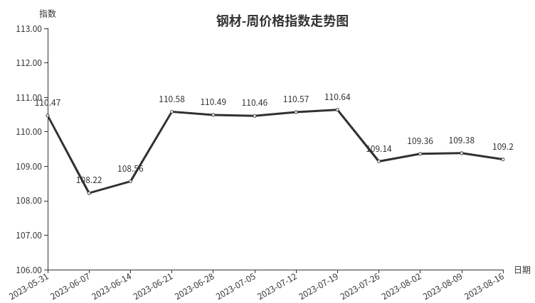 本周,钢材类周价格指数收于109.20点,环比下跌0.18点,跌幅0.18%。从盘面看,三级分类中全部出现下跌,其中型材类、建筑钢材类、管材类、板材类指数分别下跌0.29点、0.17点、0.16点和0.09点。