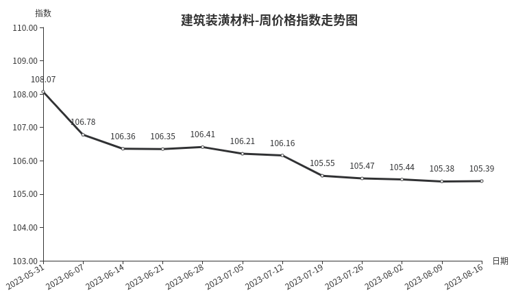 本周,建筑装潢材料类周价格指数收于105.39点,环比上涨0.01点,涨幅0.01%。从盘面看,二级分类中涨多跌少,其中结构安装材料类、装饰材料类、专用材料类环比上涨,指数分别上涨0.07点、0.01点和0.01点,结构材料类指数微降,指数下降0.04点。