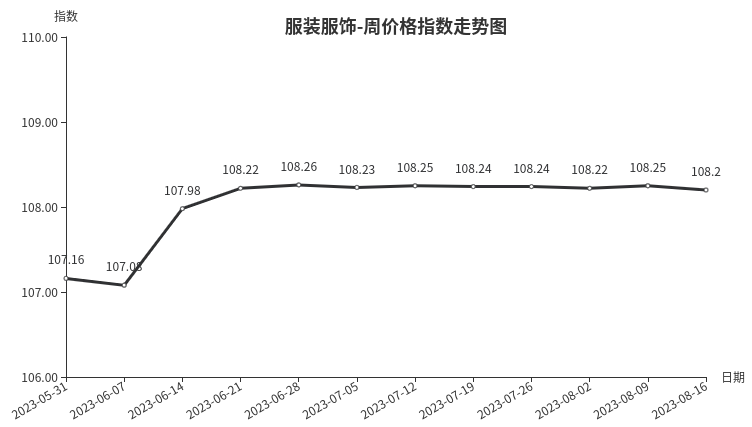 本周,服装服饰类周价格指数收于108.20点,环比下跌0.05点。从盘面看,腰带、男装类分别下跌0.20、0.10点,是导致服装服饰类周价格指数下跌的主要因素。