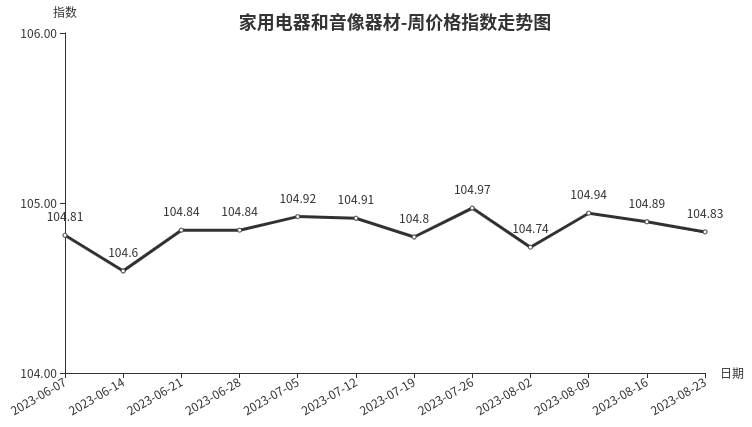 本周,家用电器和音像器材类价格指数收于104.83点,环比下跌0.06点。从二级分类看,厨房电器价格回落,下跌0.31点;净化电器、音像器材继续走低,分别下跌0.17、0.01点;制冷电器、个人生活电器价格反弹,分别上涨0.44、0.03点;热水器价格继续微涨0.01点。