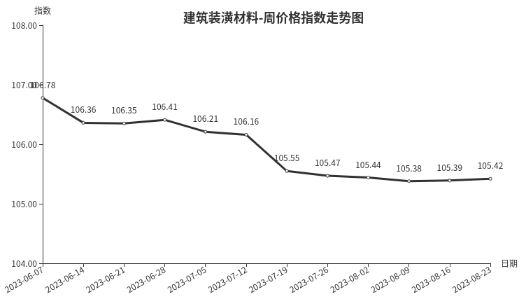 本周,建筑装潢材料类周价格指数收于105.42点,环比上涨0.03点,涨幅0.03%。从盘面看,二级分类中互有涨跌,其中结构材料类、装饰材料类环比上涨,指数分别上涨0.02点和0.03点,成拉动指数上涨主要因素。结构安装材料类指数微降,指数下降0.04点;专用材料类指数与上周持平。