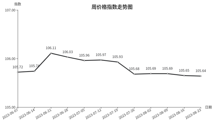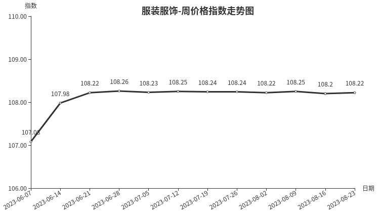 本周,服装服饰类周价格指数收于108.22点,环比上涨0.02点。从盘面看,鞋、腰带、内衣类分别上涨0.07、0.04和0.04点,是拉动服装服饰类周价格指数上涨的主要原因。