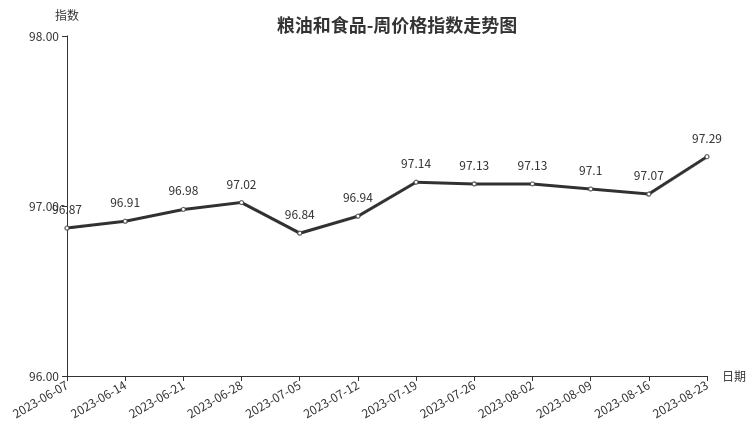 本周,粮油和食品类周价格指数收于97.29点,环比上涨0.22点,涨幅0.23%。从盘面看,涨幅居前的是副食类和茶叶类,分别上涨1.51点和0.38点,是拉动粮油和食品类周价格指数上涨的主要因素。