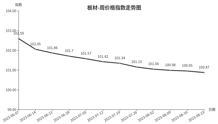 本周,板材类周价格指数收于100.87点,环比下跌0.08点,跌幅0.08%。从指数构成要素看,材料板材、周转板材周价格指数均出现小幅下跌,分别下跌0.08点、0.09点。