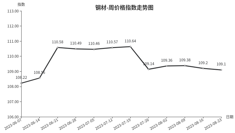 本周,钢材类周价格指数收于109.10点,环比下跌0.10点,跌幅0.09%。从盘面看,三级分类中全部出现下跌,其中型材类跌幅最大,指数环比下跌0.24点,成拉动指数下跌主力;管材类、建筑钢材类、板材类微幅下跌,指数分别下跌0.09点、0.04点和0.03点。