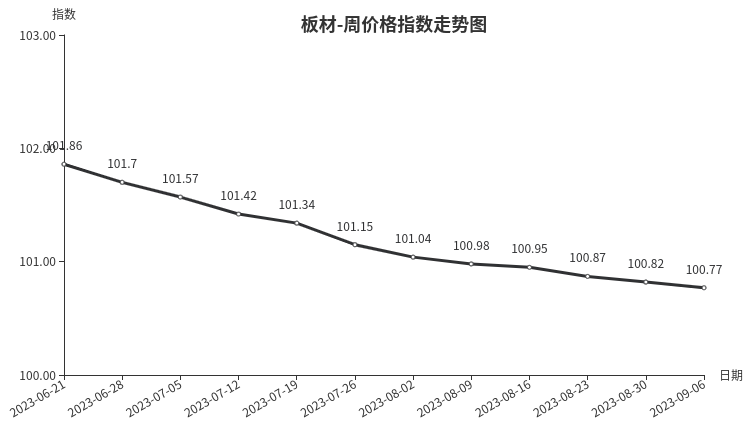 本周,板材类周价格指数收于100.77点,环比下跌0.05点,跌幅0.05%。从指数构成要素看,材料板材、周转板材周价格指数均出现小幅下跌,分别下跌0.04点、0.08点,跌幅分别为0.04%、0.08%。