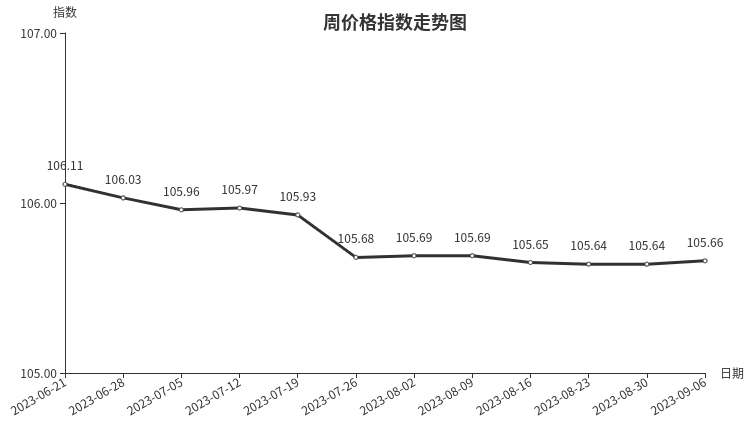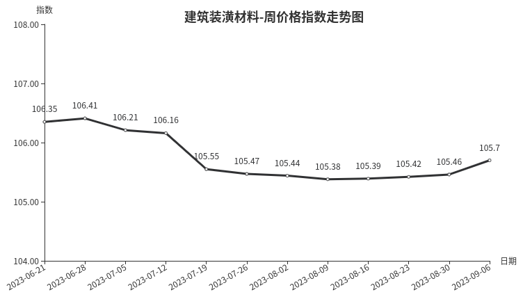 本周,建筑装潢材料类周价格指数收于105.70点,环比上涨0.24点,涨幅0.23%。从盘面看,二级分类中装饰材料类涨幅最大,指数环比上涨0.25点,成拉动指数上涨主力,结构安装材料类、专用材料类环比上涨,指数分别上涨0.04点和0.02点;结构材料类指数与上周持平。