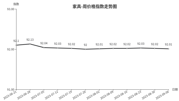 本周,家具类周价格指数收于92.01点,环比下跌0.01点,从盘面看,柜类、床及用品类分别下跌0.04点和0.01点,是导致家具类周价格指数下跌的主要原因。