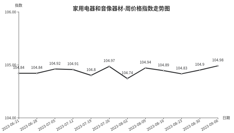 本周,家用电器和音像器材类价格指数收于104.98点,环比上涨0.08点。从二级分类看,净化电器价格回升幅度较大,上涨0.44点,厨房电器、热水器价格继续上行,分别上涨0.36、0.09点,音像器材价格小幅上涨0.06点;制冷电器价格回落,下跌0.28点,个人生活电器价格继续走低,环比下跌0.19点。