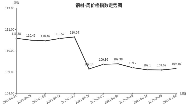 本周,钢材类周价格指数收于109.16点,环比上涨0.07点,涨幅0.06%。从盘面看,三级分类全部上涨,其中型材、板材类、管材类、建筑钢材类指数分别上涨0.28点、0.10点、0.02点和0.02点。