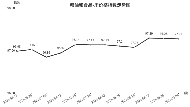本周,粮油和食品类周价格指数收于97.27点,环比下跌0.01点,跌幅0.01%。从盘面看,调味品类跌幅较大,下跌0.31点,跌幅0.19%,是导致粮油和食品类周价格指数下跌的主要原因;其它品类周价格指数波动较小。