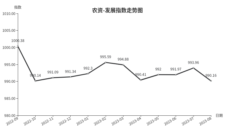 8月份,农资类发展指数收于990.16点,环比上月下跌3.81点。