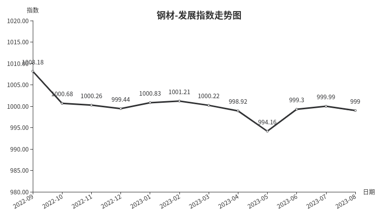 8月份,钢材类发展指数收于999.00点,环比上月下跌0.99点,跌幅0.99%。其中发展规模指数、发展效益指数、发展信心指数分别下跌1.23点、0.06点和2.39点。