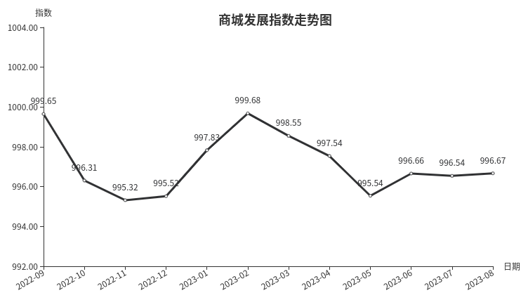 据临沂商城指数系统监测,8月份临沂商城发展指数收于996.67点,环比上涨0.13点,涨幅0.01%。