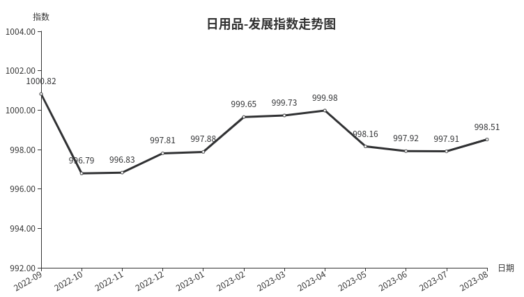 8月份,日用品类发展指数收于998.51点,环比上涨0.60点。其中,发展规模指数、发展效益指数分别上涨0.46、1.07点,发展信心指数微跌0.03点。