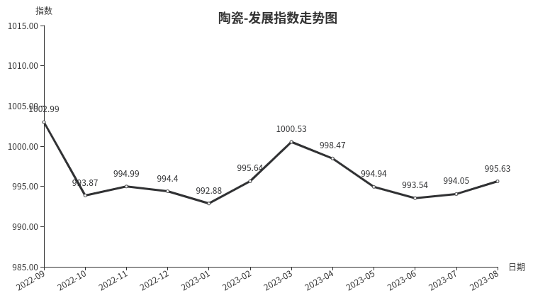 8月份,陶瓷类发展指数收于995.63点,环比上涨1.58点,涨幅1.59%。