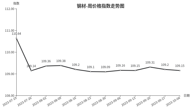 本周,钢材类周价格指数收于109.15点,环比下跌0.05点,跌幅0.05%。从盘面看,钢材三级分类中多数下跌,其中管材类、建筑钢材类、板材类微幅下跌,指数小幅下跌0.08点、0.04点和0.02点,拉动整体指数下行;型材类指数上涨0.02点。