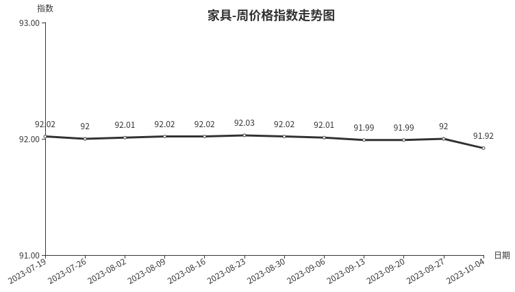 本周,家具类周价格指数收于91.92点,环比下跌0.08点,从盘面看,床及用品类、桌类和坐具类分别下跌0.22点、0.08点和0.03点,是导致家具类周价格指数下跌的主要原因。