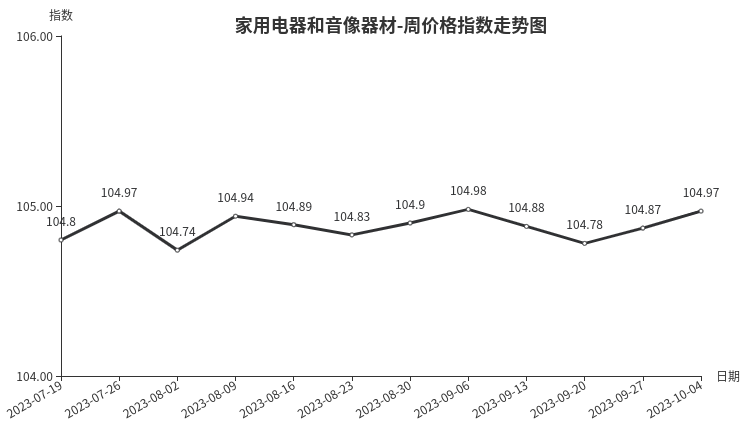 本周,家用电器和音像器材类价格指数收于104.97点,环比上涨0.10点。从二级分类看涨多跌少,净化电器、制冷电器、厨房电器、个人生活电器、热水器价格指数分别上涨0.91、0.16、0.13、0.09、0.05点;音像器材类价格指数下跌0.09点。