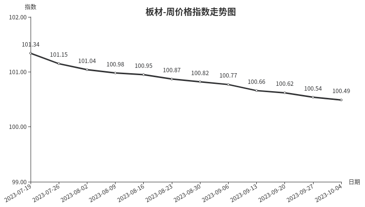 本周,板材类周价格指数收于100.49点,环比下跌0.05点,跌幅0.05%。从指数构成要素看,材料板材周价格指数出现小幅下跌,下跌0.06点,跌幅0.06%;周转板材周价格指数环比持平。