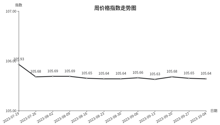 据临沂商城价格指数信息系统监测,本周临沂商城周价格总指数为105.64点,环比下跌0.01点,跌幅0.01%。