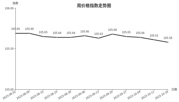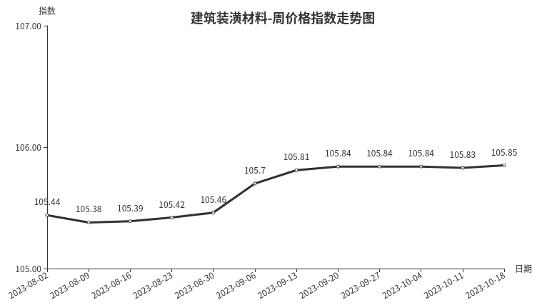 本周,建筑装潢材料类周价格指数收于105.85点,环比上涨0.02点,涨幅0.02%。从盘面看,二级分类中互有涨跌,其中专用材料类、装饰材料类环比上涨,指数分别上涨0.12点、0.02点,结构材料类、结构安装材料类指数微降,指数下降0.02点和0.04点。
