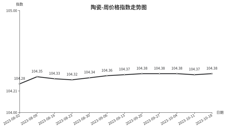本周,陶瓷类周价格指数收于104.38点,环比上涨0.01点,涨幅0.01%。从指数构成要素看,日用陶瓷、建筑陶瓷周价格指数小幅上涨,分别上涨0.02点、0.01点,涨幅分别为0.02%、0.01%;陶瓷洁具周价格微降,降幅0.02%。