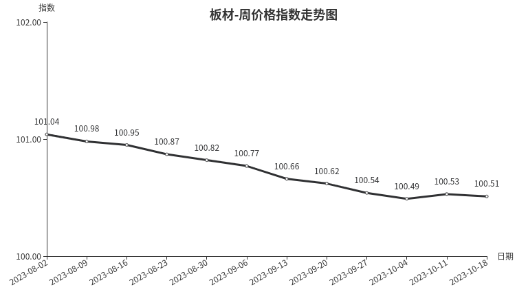 本周,板材类周价格指数收于100.51点,环比下跌0.02点,跌幅0.02%。从指数构成要素看,材料板材、周转板材周价格指数小幅下跌,均下跌0.02点。