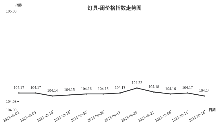 本周,灯具类周价格指数收于104.14点,环比下跌0.03点。从盘面看,家居照明类、灯具配件类价格回落,均下跌0.05点;户外照明类继续下跌0.02点;商业照明类微降0.01点;工艺灯及灯饰类指数与上周持平。
