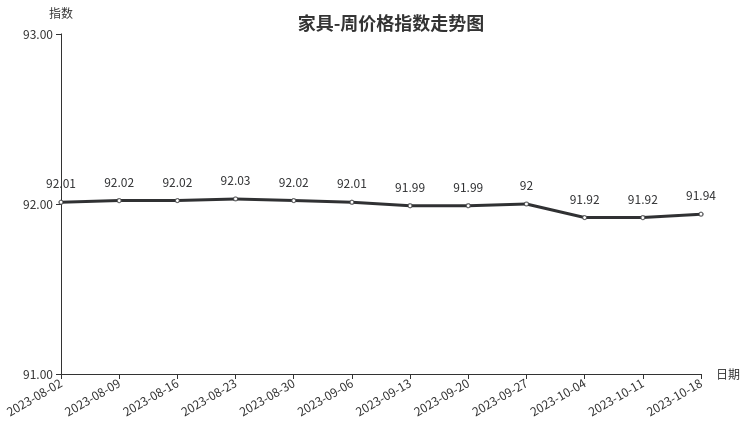本周,家具类周价格指数收于91.94点,环比上涨0.02点。从盘面看,柜类、桌类分别上涨0.06点、0.02点,是拉动家具类周价格指数上涨的主要因素,坐具类、床及用品类和架类价格指数无变化。