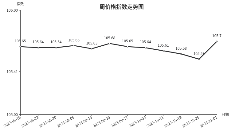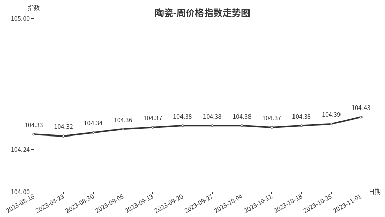 本周,陶瓷类周价格指数收于104.43点,环比上涨0.04点,涨幅0.04%。从指数构成要素看,陶瓷洁具、建筑陶瓷周价格指数上涨,分别上涨0.14点、0.01点,涨幅分别为0.13%、0.01%;日用陶瓷周价格指数小幅下跌,跌幅0.01%。