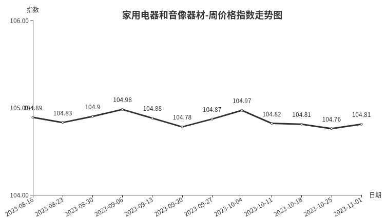 本周,家用电器和音像器材类价格指数收于104.81点,环比上涨0.05点。二级分类中制冷电器、家居电器价格回升,分别上涨0.61、0.07点,涨幅较大,是拉动家用电器和音像器材类价格上涨的主要因素;净化电器、热水器、厨房电器、个人生活电器类价格指数分别下跌0.24、0.06、0.03、0.01点。