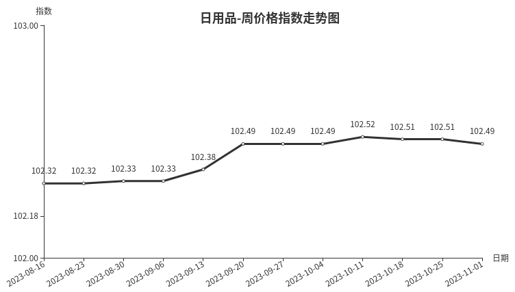 本周,日用品类周价格指数收于102.49点,环比下跌0.02点,从二级分类看,针/纺织品、工艺品、厨房用品类分别下跌0.29点、0.01点和0.01点,是导致周价格指数下跌的主要因素。