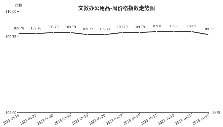 本周,文教办公用品类周价格指数收于109.77点,环比下跌0.03点,跌幅0.03%。文化办公用品类和体育娱乐用品类分别下跌0.04点和0.01点,是导致文教办公用品类周价格指数下跌的主要因素。