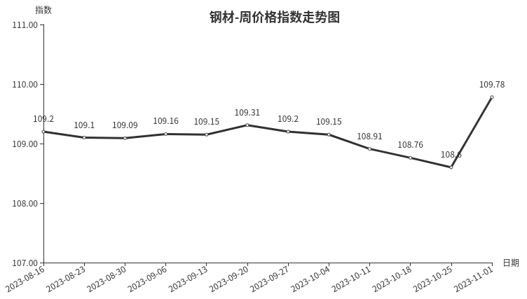 本周,钢材类周价格指数收于109.78点,环比上涨1.18点,涨幅1.09%。从盘面看,三级分类全部上涨,其中板材类、建筑钢材类、型材类、管材类指数分别上涨1.50点、1.50点、1.44点和0.95点。