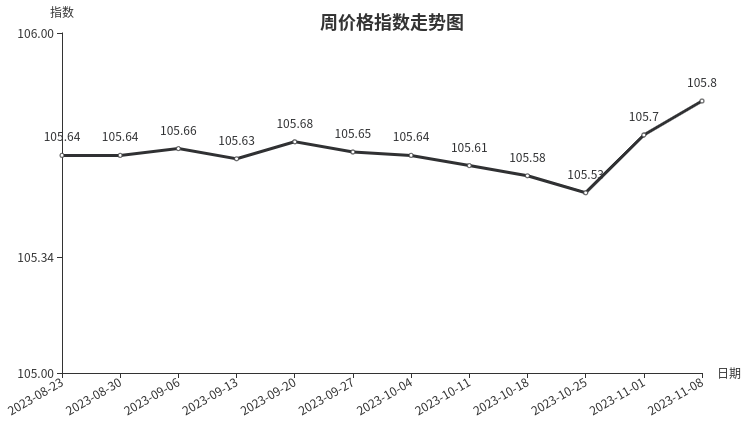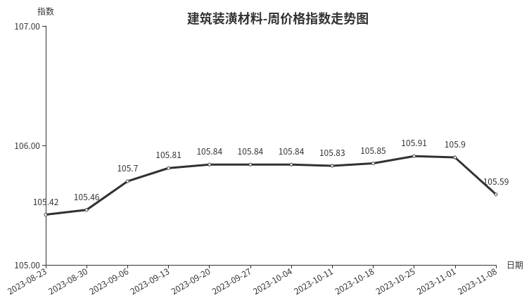 本周,建筑装潢材料类周价格指数收于105.59点,环比下跌0.31点,跌幅0.29%。从盘面看,二级分类中互有涨跌,其中装饰材料类跌幅最大,指数环比下跌0.34点,成拉动指数下跌主要因素;结构安装材料类、专用材料类指数上涨0.14点和0.01点,结构材料类指数与上周持平。