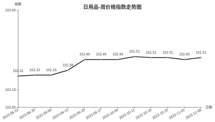 本周,日用品类周价格指数收于102.51点,环比上涨0.02点,涨幅0.02%。从二级分类看,箱包、玩具、针纺织品、工艺品、卫生清洁用品周价格指数小幅上涨,分别上涨0.40%、0.06%、0.04%、0.03%、0.02%。