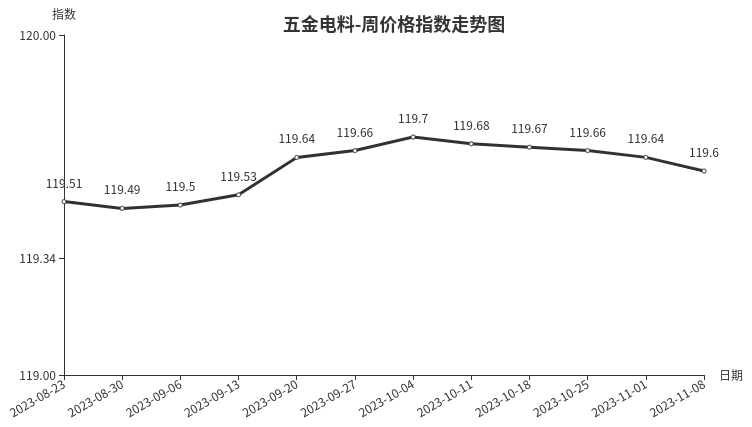 本周,五金电料类周价格指数收于119.60点,环比下跌0.04点。二级分类中的电线电缆、五金工具、建筑装潢材料类分别下跌0.06、0.05、0.03点;电工电器类上涨0.02点。