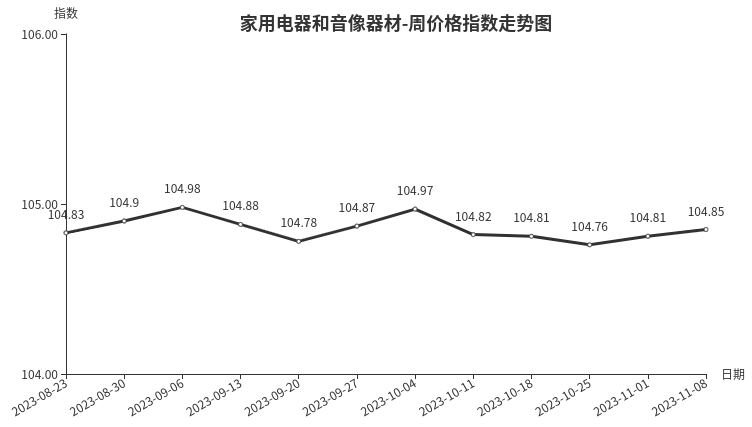 本周,家用电器和音像器材类价格指数收于104.85点,环比上涨0.04点。二级分类中厨房电器、个人生活电器、热水器类价格指数小幅上涨,分别上涨0.12、0.11、0.02点;制冷电器、家居电器价格回落,净化电器价格继续下降,分别下跌0.04、0.02、0.01点。