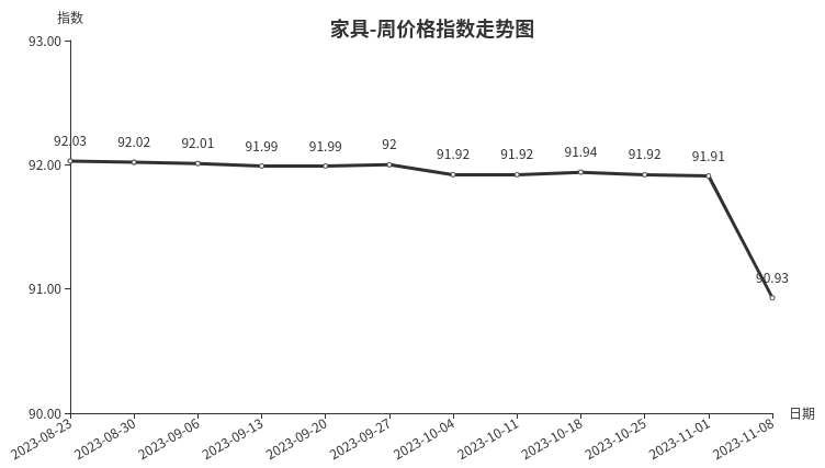 本周,家具类周价格指数收于90.93点,环比下跌0.98点。从盘面看,桌类、柜类、坐具类、床及用品类分别下跌2.62点、1.46点、0.55点和0.06点,是导致家具类周价格指数下跌的主要原因。