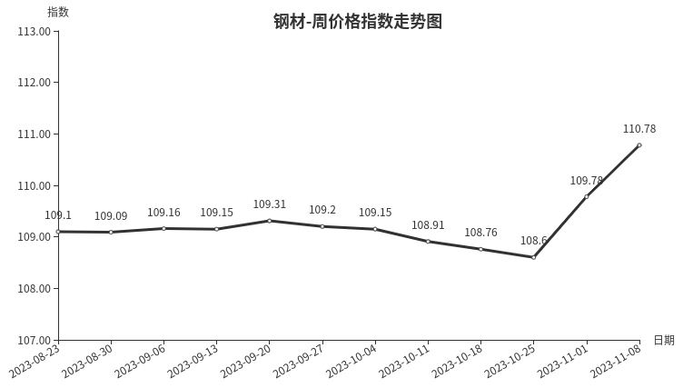 本周,钢材类周价格指数收于110.78点,环比上涨1.00点,涨幅0.91%。从盘面看,三级分类全部上涨,其中型材类、建筑钢材类、管材类、板材类指数分别上涨1.28点、1.20点、0.84点和0.89点。