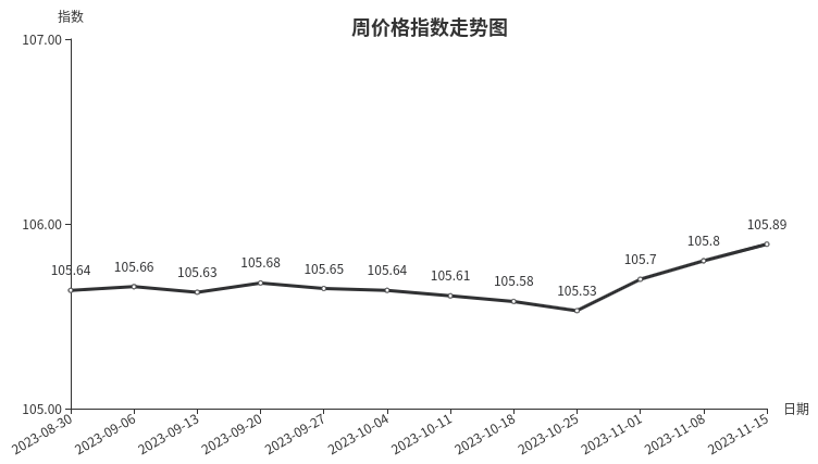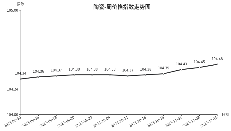 本周,陶瓷类周价格指数收于104.48点,环比上涨0.03点,涨幅0.03%。从指数构成要素看,日用陶瓷周价格指数环比小幅上涨,上涨0.18点,涨幅0.17%;建筑陶瓷、陶瓷洁具周价格指数环比持平。