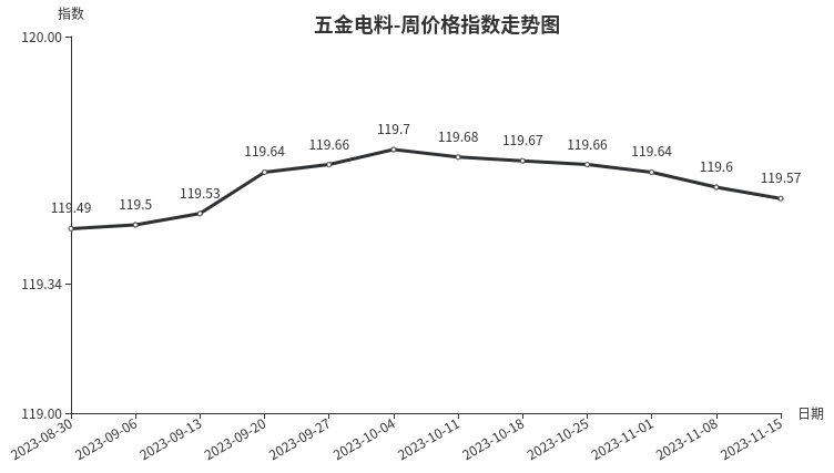 本周,五金电料类周价格指数收于119.57点,环比下跌0.03点。二级分类中跌多涨少,电线电缆、建筑装饰五金类继续下跌,分别下跌0.40、0.04点,五金零部件、电工电器类均下跌0.03点;五金工具微涨0.01点。