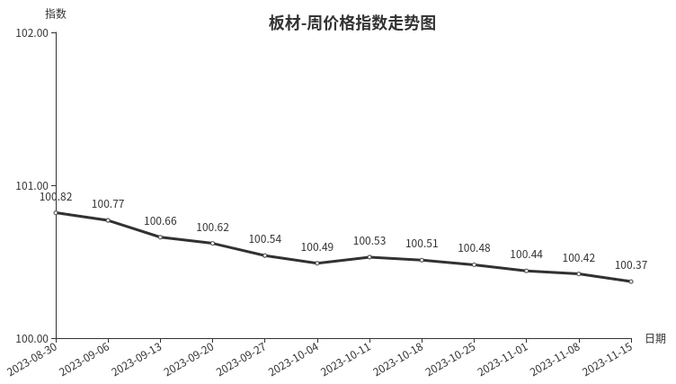 本周,板材类周价格指数收于100.37点,环比下跌0.05点,跌幅0.05%。从指数构成要素看,材料板材、周转板材周价格指数均小幅下跌,分别下跌0.06点、0.04点,跌幅分别为0.06%、0.04%。