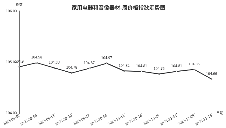 本周,家用电器和音像器材类价格指数收于104.66点,环比下跌0.19点。从二级分类看,厨房电器、个人生活电器、制冷电器、取暖电器类指数分别下跌0.64点、0.12点、0.11点、0.04点;净化电器、音像器材、家居电器类指数分别上涨0.30点、0.04点和0.01点。
