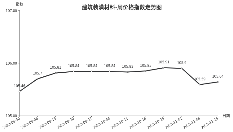 本周,建筑装潢材料类周价格指数收于105.64点,环比上涨0.05点,涨幅0.05%。从盘面看,二级分类中多数上涨,其中结构安装材料类、装饰材料类、专用材料类环比上涨,指数分别上涨0.07点、0.05点和0.01点,结构材料类指数与上周持平。