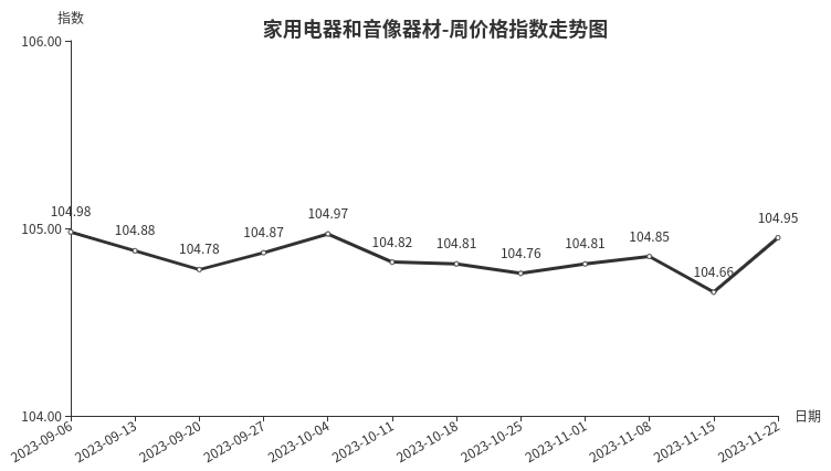 本周,家用电器和音像器材类价格指数收于104.95点,环比上涨0.29点。从二级分类看,厨房电器、制冷电器、个人生活电器类回升,指数分别上涨0.88、0.46、0.02点;净化电器、音像器材、热水器类均继续上涨0.02点;家居电器类微降0.02点。