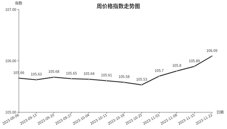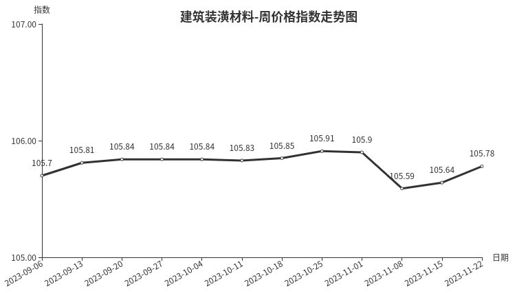本周,建筑装潢材料类周价格指数收于105.78点,环比上涨0.14点,涨幅0.13%。从盘面看,二级分类多数上涨,其中装饰材料类涨幅最大,指数环比上涨0.14点,成拉动指数上涨主要因素;结构安装材料类、专用材料类环比上涨,指数分别上涨0.01点和0.01点,结构材料类指数与上周持平。