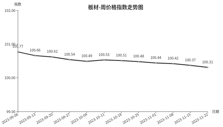 本周,板材类周价格指数收于100.31点,环比下跌0.06点,跌幅0.06%。从指数构成要素看,材料板材周价格指数小幅下跌0.08点,跌幅0.08%;周转板材周价格指数微涨,涨幅0.03%。